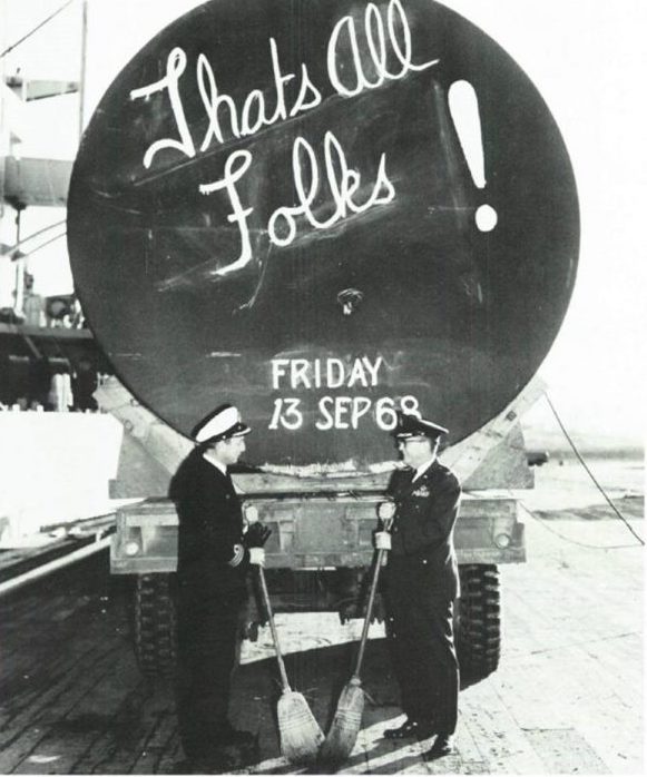 Le 15 mars, les Américains et les Danois déclaraient que l’opération de dépollution du projet Crested Ice (glace cristalline) était terminée. Un tel cycle court pour le lavage d’une terre et d’une mer polluées par la radioactivité artificielle et le kérosène plombé restera unique dans les annales de l’humanité. Le cycle long des pathologies déclenchées à retardement par l’inhalation des aérosols radioactifs et le contact avec les débris a été balayé. Quand, l’été venu, après la fonte de la banquise, deux cargos américains sont venus charger les fûts et autres emballages contenant du contreplaqué irradié, des pneus, des vêtements, des outils, et les 67 citernes contenant environ 6000 tonnes de neige radioactive, l’affaire a été considérée comme vertueuse et terminée. En témoigne la pose prise par le commandant de la base aérienne de Thulé et l’officier de liaison danois avant l’embarquement de la dernière citerne taguée d’un triomphal et définitif “That’s all folks !” (C’est terminé les amis !).